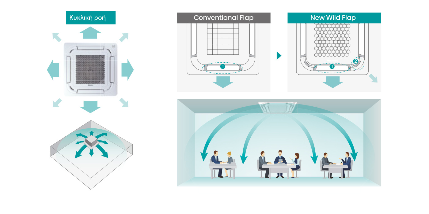 Κυκλική ροή αέρα για ισορροπημένη θερμοκρασία σε κάθε γωνιά του χώρου.