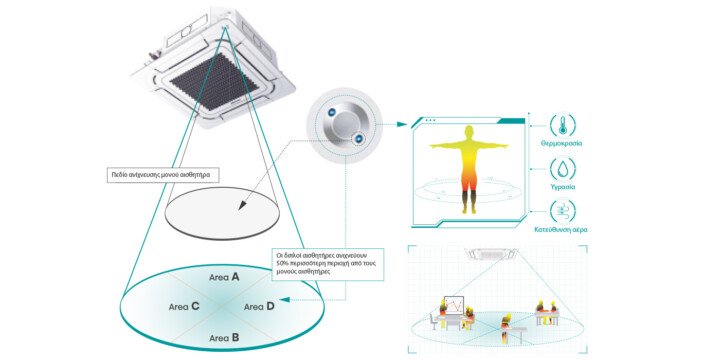 Είτε κάθεστε, είτε κινείστε με τους διπλούς αισθητήρες κίνησης (smart eye) απολαμβάνετε τη θερμοκρασία που έχετε επιλέξει. Επίσης, κατά την απουσία σας από τον χώρο το κλιμαστιστικό σταματά να λειτουργεί για εξοικονόμηση ενέργεας.
